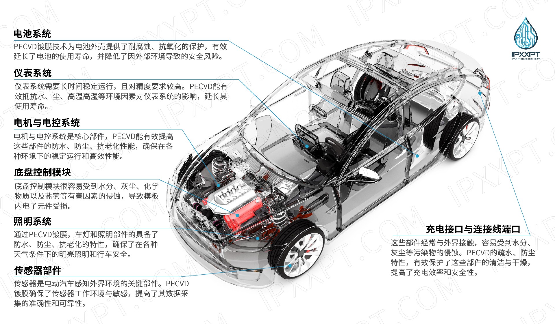 电动汽车零部件多样、复杂、精密、敏感,而使用环境更复杂多样。电机和电控系统、电池系统作为其的“心脏”,对水分、灰尘和腐蚀性物质的侵入尤为敏感。一旦这些部件受到水分的侵入,不仅可能导致电路短路、性能下降,甚至可能引发火灾或爆炸等严重后果。底盘控制模块、仪表系统、传感器部件、照明系统、充电接口与连接线端口等,长期暴露在高温高湿或含有腐蚀性物质的环境中,容易引发老化、腐蚀,从而影响其性能和寿命。PECVD镀膜技术的应用发挥了独特优势,它不仅提高了这些部件的防水、防尘性能,确保其在各种恶劣环境下的稳定运行,还能增强部件的耐腐蚀、抗老化性能,增强其环境适应性和使用寿命。